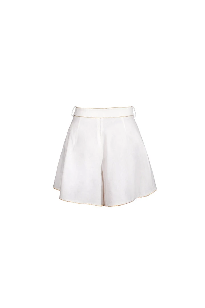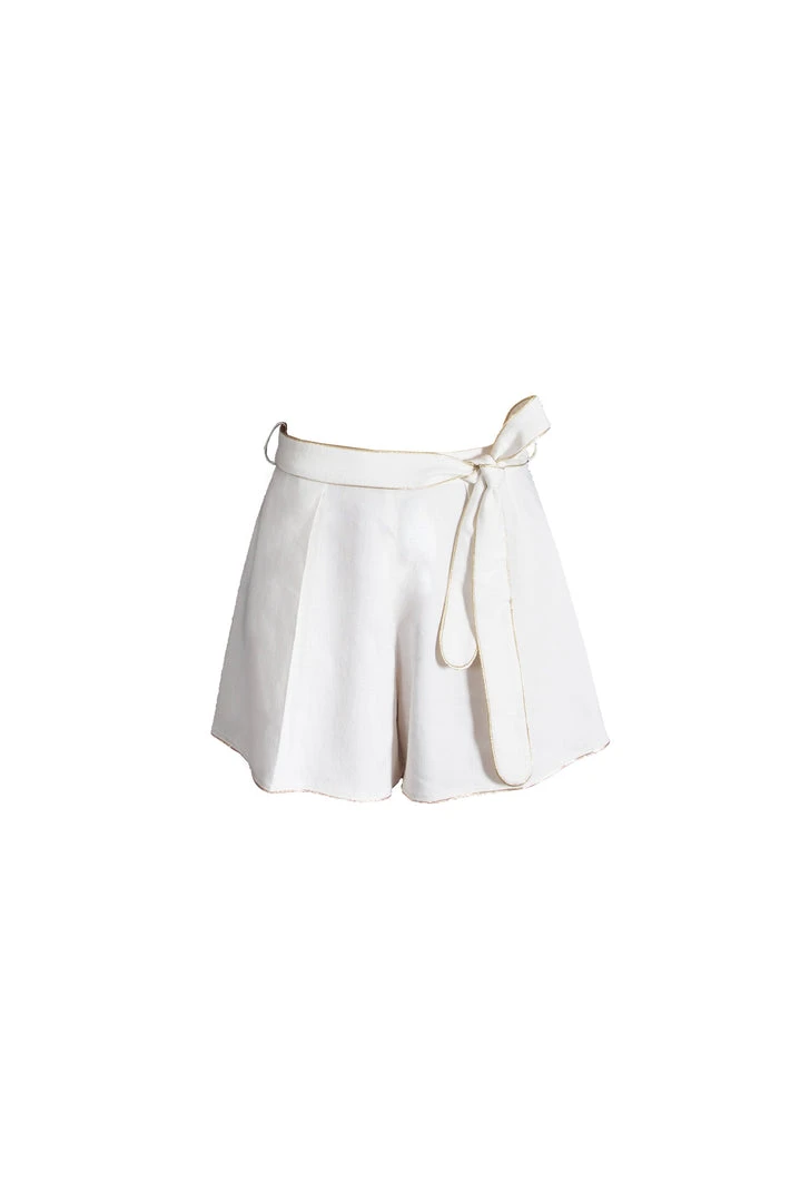 Versatile lightweight cotton shorts, featuring delicate gold trim and an adjustable tie-belt.Â