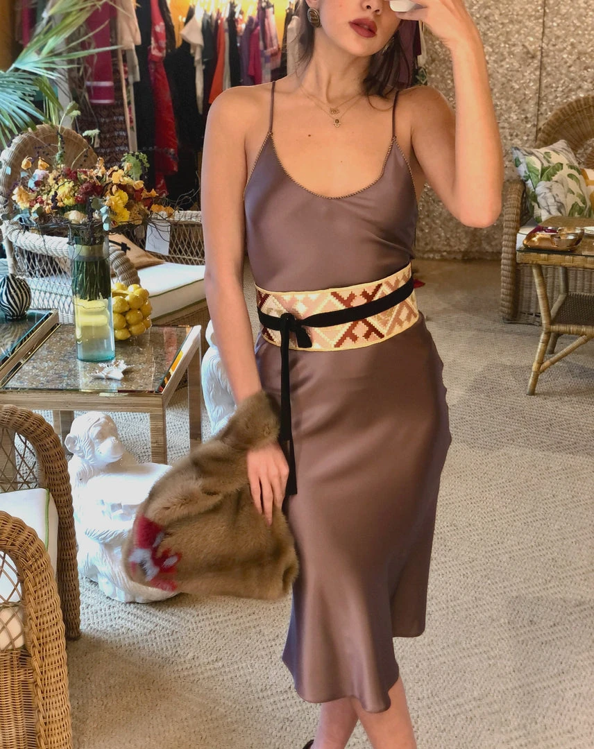 Strappy midi slip-dress, with gold thread stitching for an added flair.