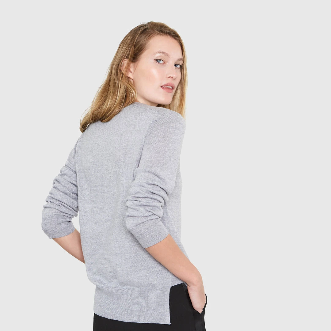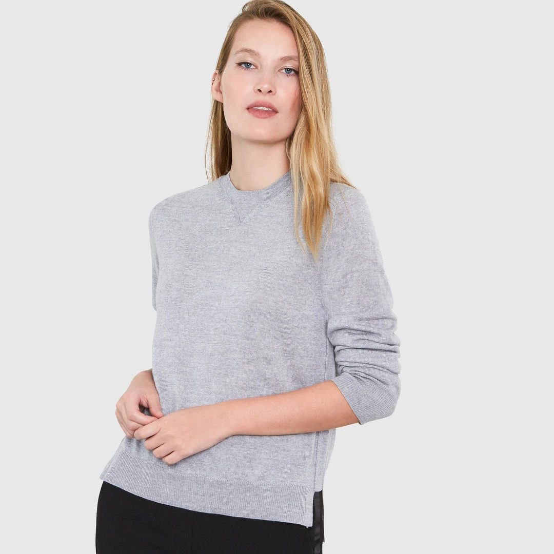 We combined the ease of a sweatshirt with the fine knitting and finishing details of a luxurious sweater and created the essential wardrobe piece. The yarn is pure Merino Wool from one of the most renowned mills in Italy. Merino has anti-bacterial natural properties, cools when the weather is hot and warms when the temperature is cold making it the perfect year-round yarn. The quality we have chosen can be machine-washed, tumble dried, and is Total Easy Care Woolmark certified. The sweater has a relaxed fit, a soft touch, and beautiful finishings that make it perfectly casual, luxurious, and elevated. The medium weight is ideal for layering or transitioning between seasons. Wrinkle and odor resistant, wear it in flight, down the slopes, or simply to lounge around. Our model wears a size 0.