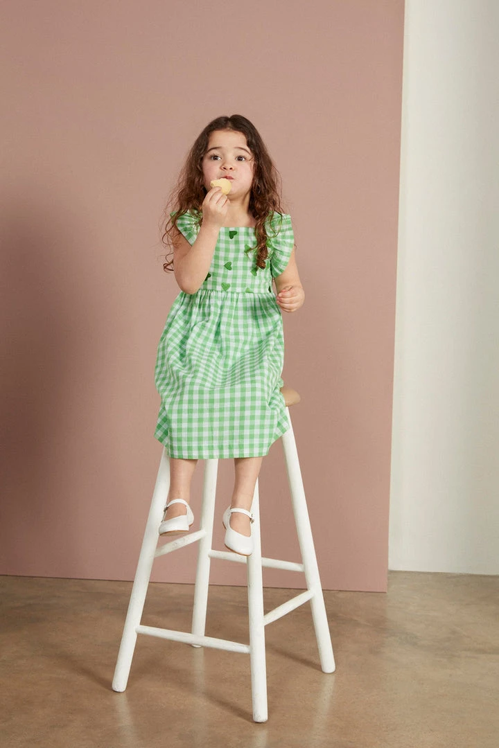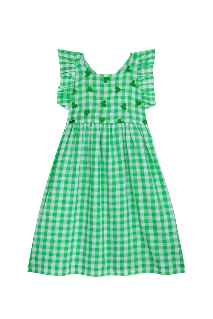 The Little Heart Dress, cut from our premium milled 100% cotton, is the sweetest of our spring dresses with beautiful embroidered green hearts. The frill sleeves are so dainty and the smocked back and bow detail are just adorable.