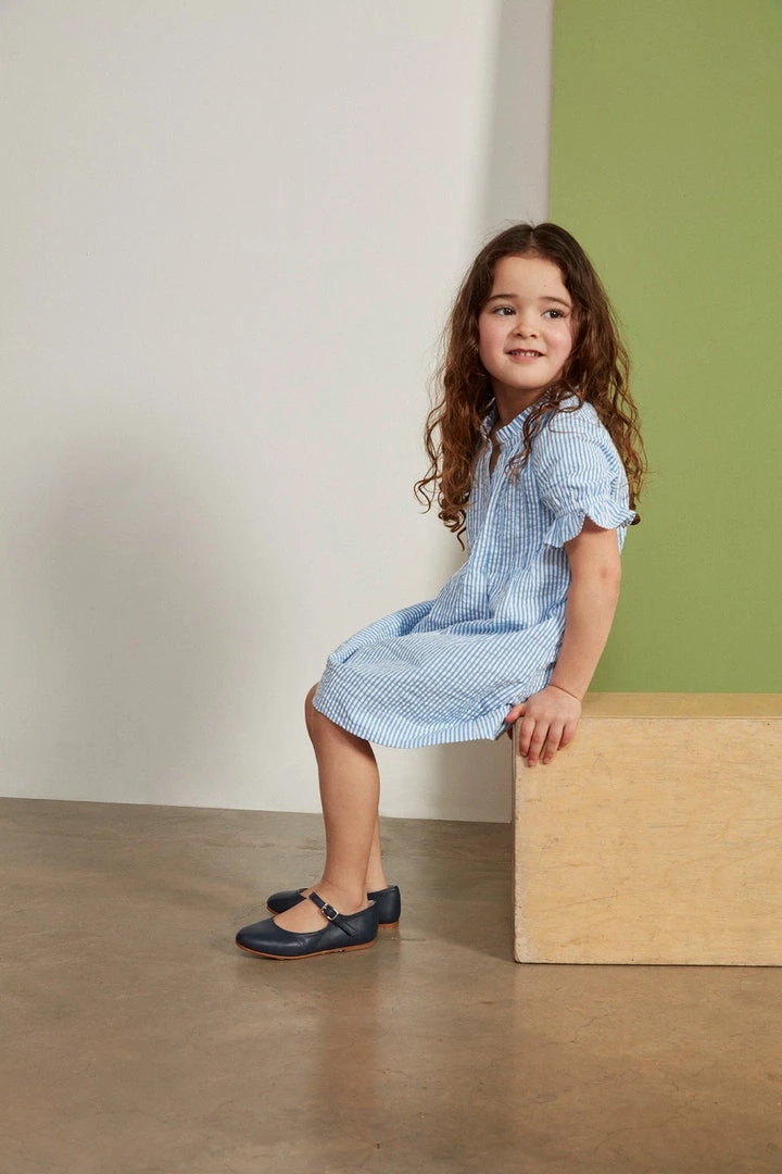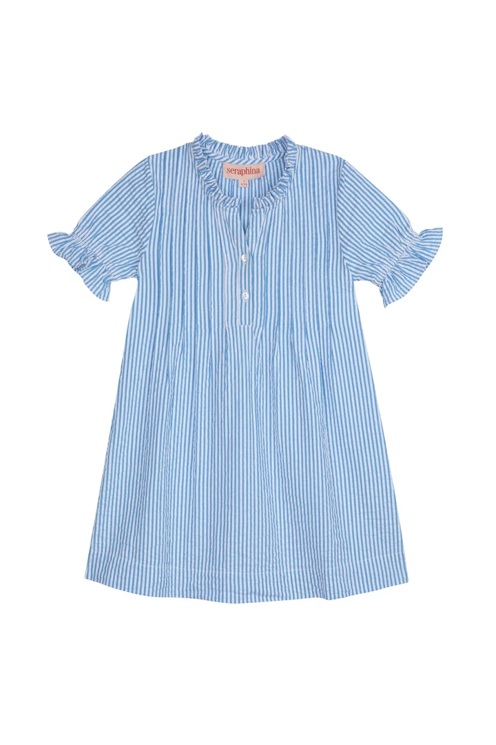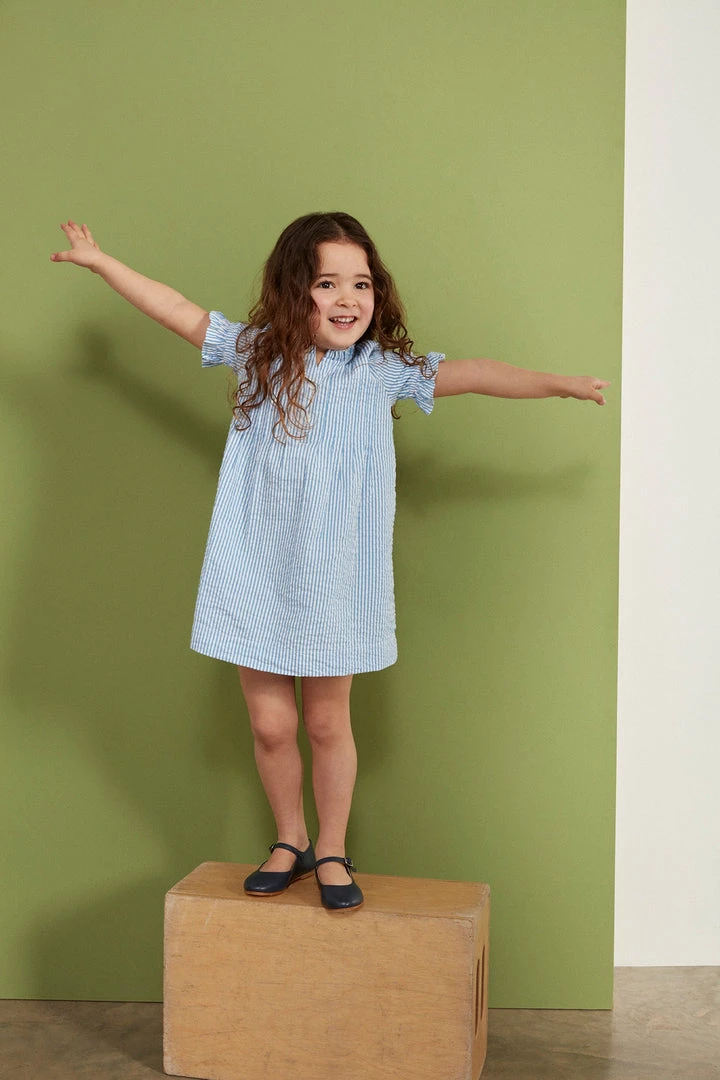 Our Little Pintuck Dress is cut from premium milled 100% blue and white stripe cotton seersucker. This sweet little dress features pintuck details on the front with frilled collar and elasticated sleeves.