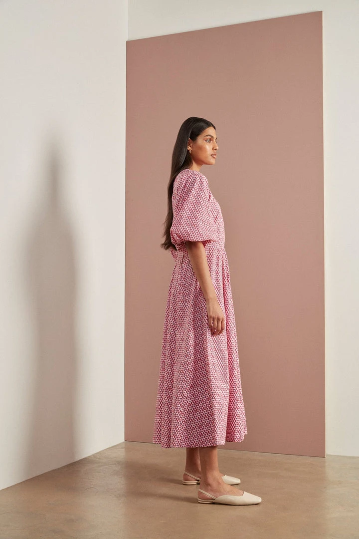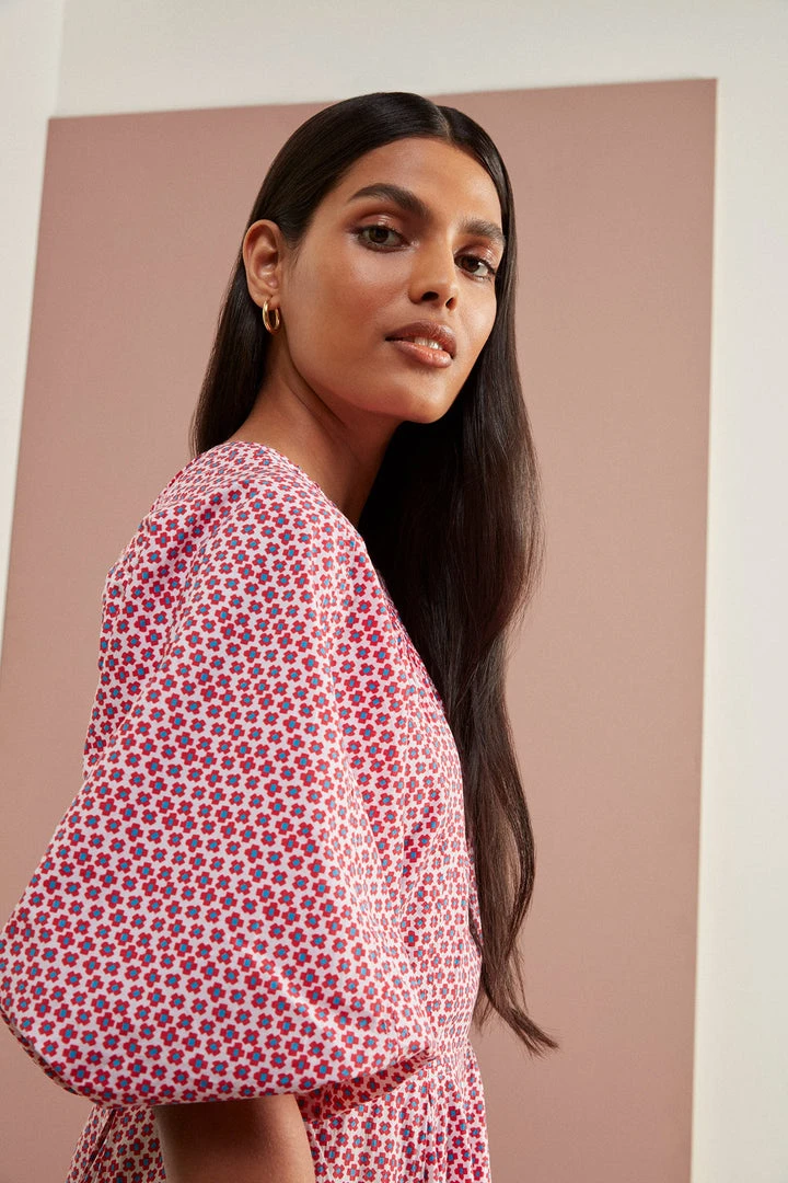 Our Sunray Dress in Tiny Red Flower print is a burst of colour, cut from our premium milled 100% cotton poplin, it features a beautiful pintuck detail on the neckline. The short blouson sleeves add volume, while the pleated waist is nicely fitted.