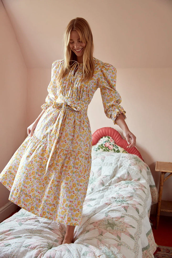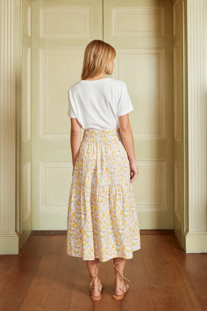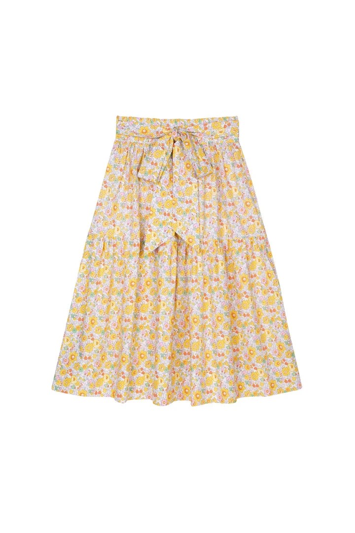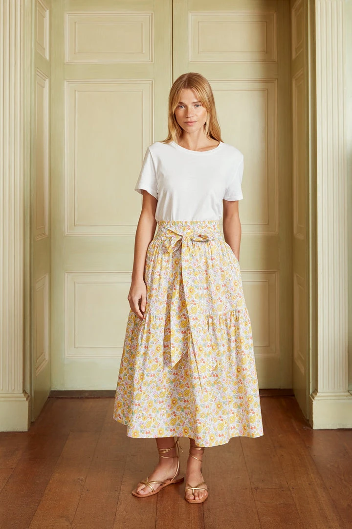The Tie Waist Skirt is made from 100% cotton poplin in a beautiful floral print. The tiered skirt has pockets, an elasticated waistband and two ties. Wear with a white t-shirt or style as a co-ord with the Smocked Blouse.Â