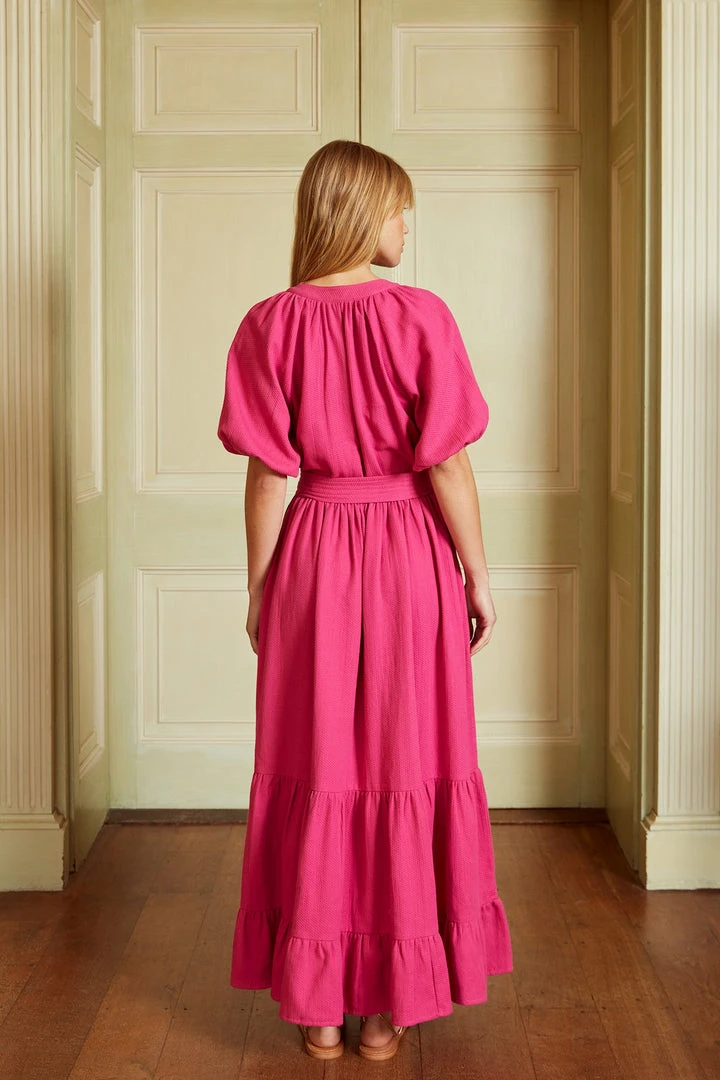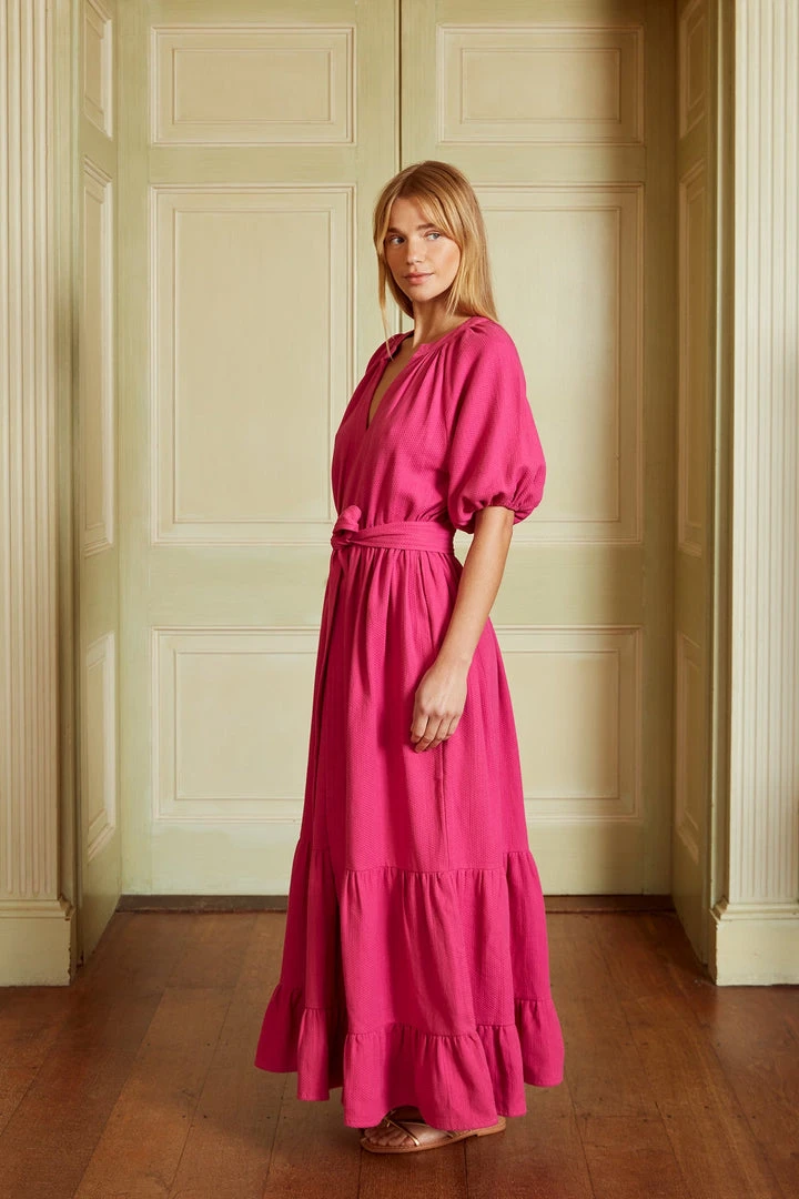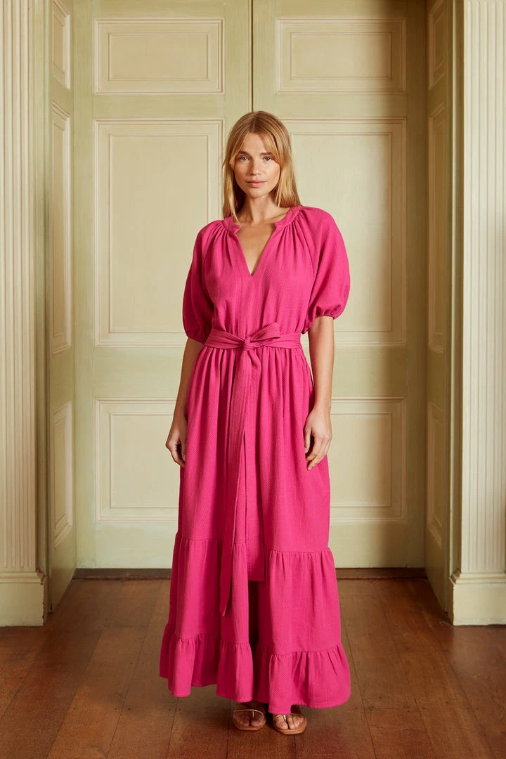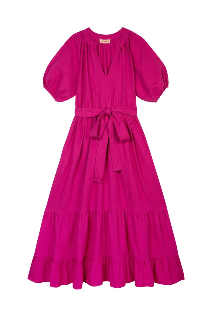 The bold and beautiful Tiered Belted Dress is cut from premium milled 100% cotton dobby and features a tiered skirt, short puff sleeves and elasticated waist with tie. Pair with sandals and it is the perfect holiday dress.Â