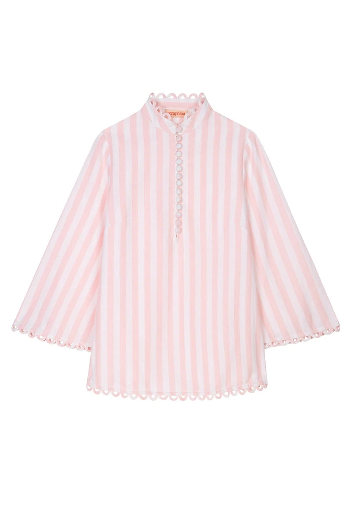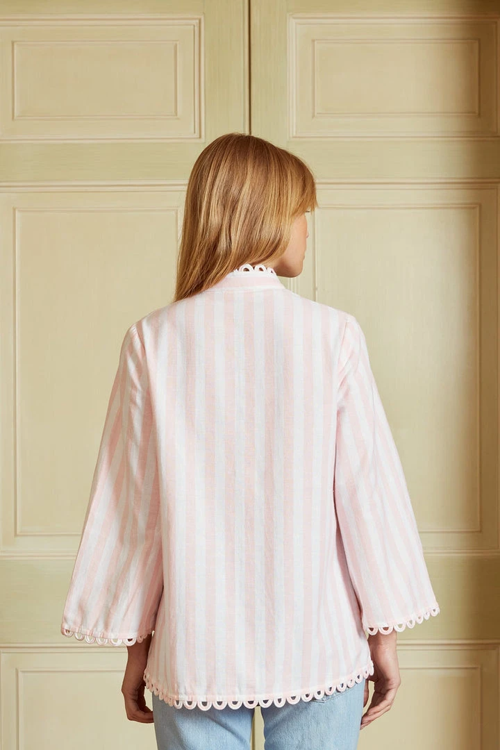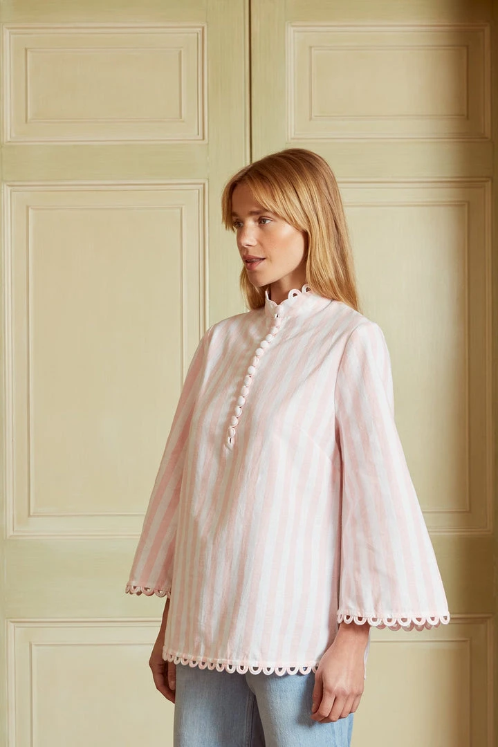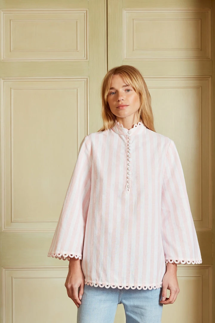 A super chic collarless tunic shirt made from 100% cotton flax in pink and white stripe. There are stunning scallop details around the collar, cuffs and hem and covered loop buttons down the front. The flared sleeves add a 70’s feel.