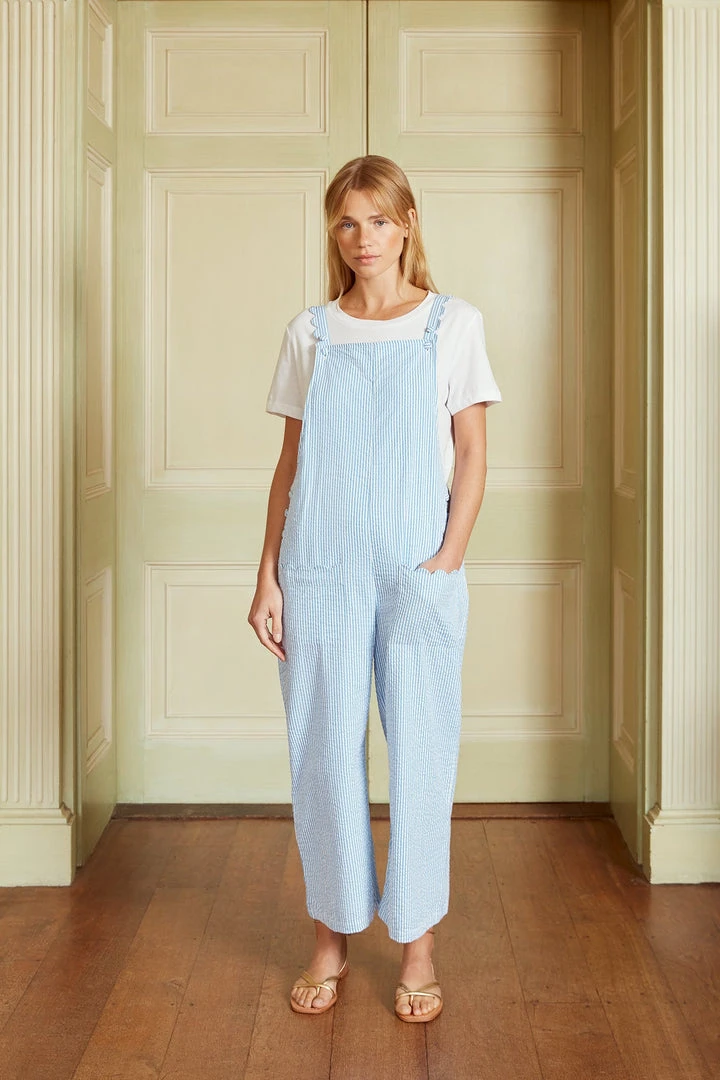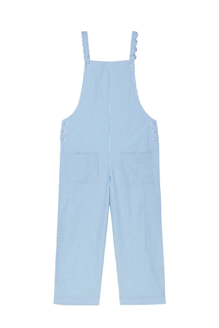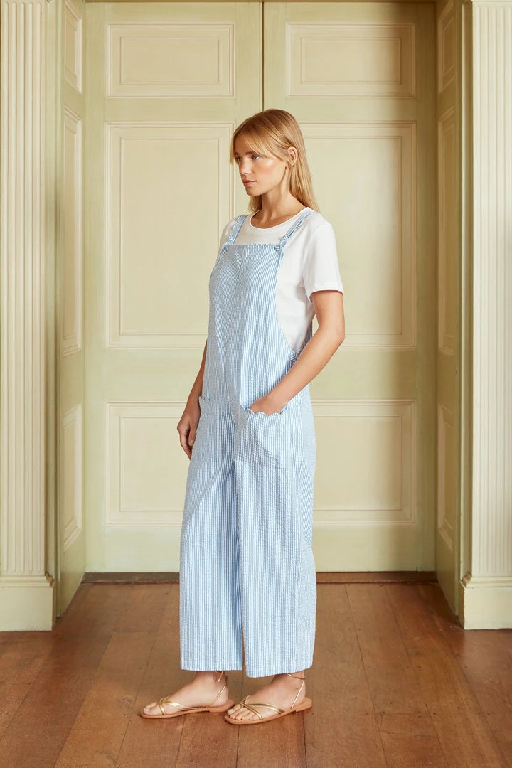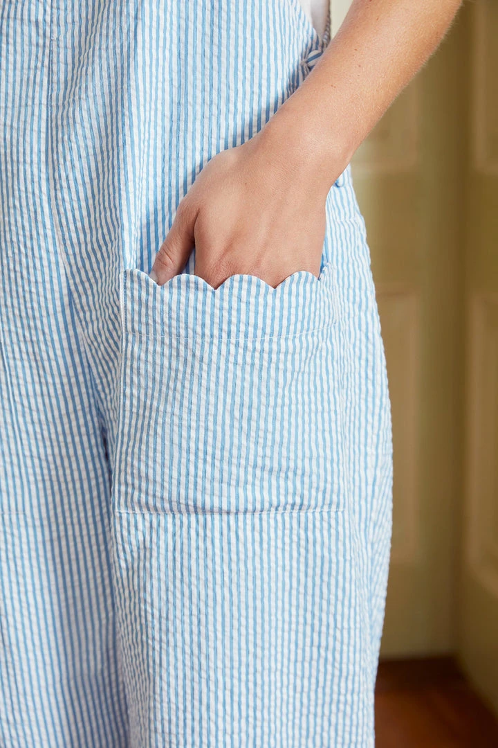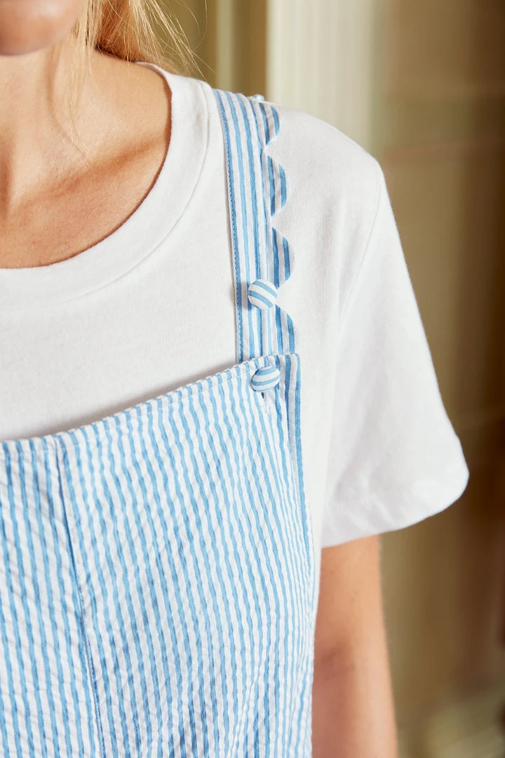 Our blue and white stripe Scallop Dungarees are made from 100% cotton seeksucker and are just heaven over a t-shirt or swimming costume. There are cute scallop details on the front pockets and adjustable straps.Â