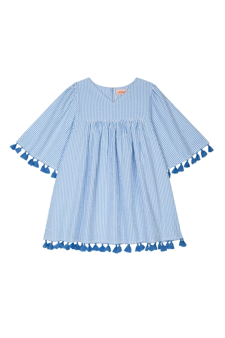 The Little Tassel Kaftan is the most darling dress for the little ones. Made from 100% blue and white cotton seersucker, it has tassel details on the flared sleeves and hem. Perfect for the beach!