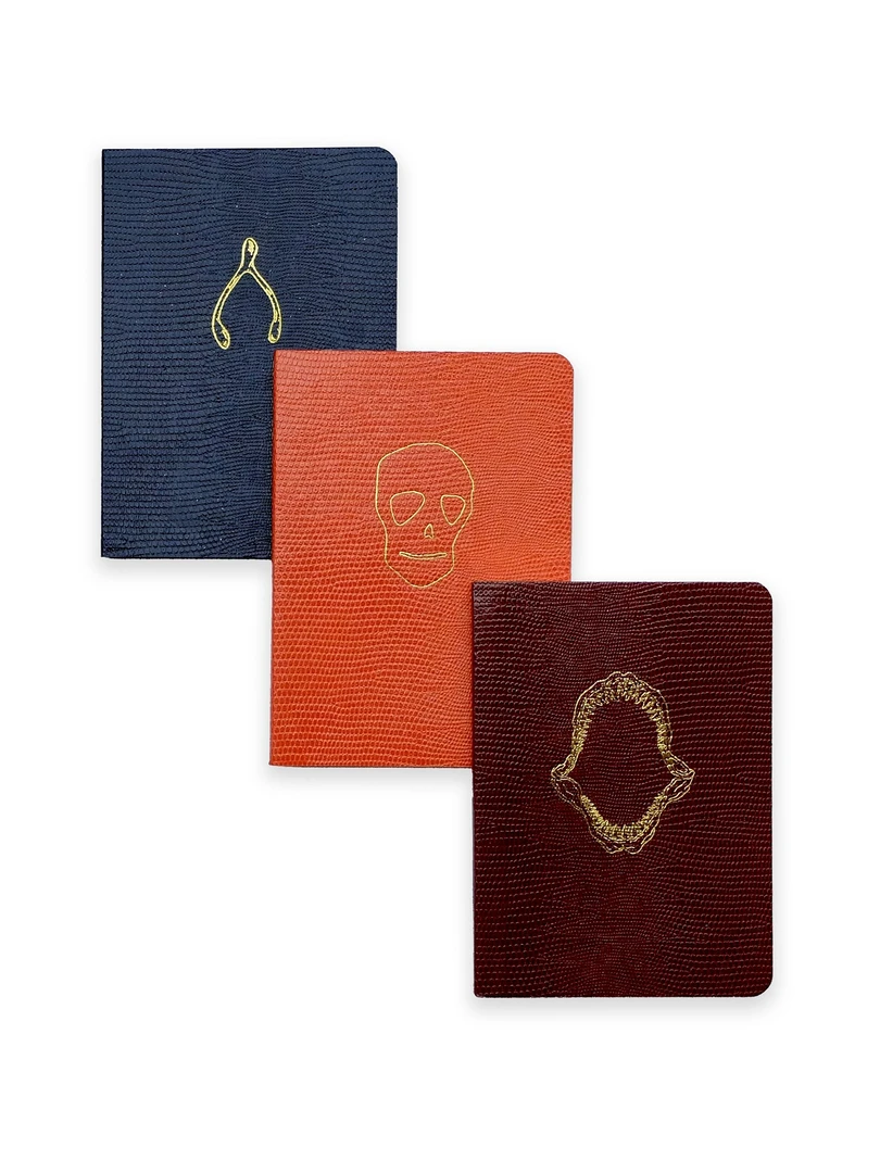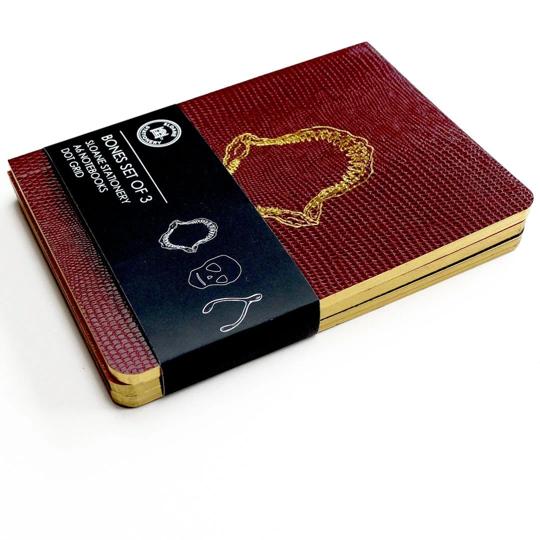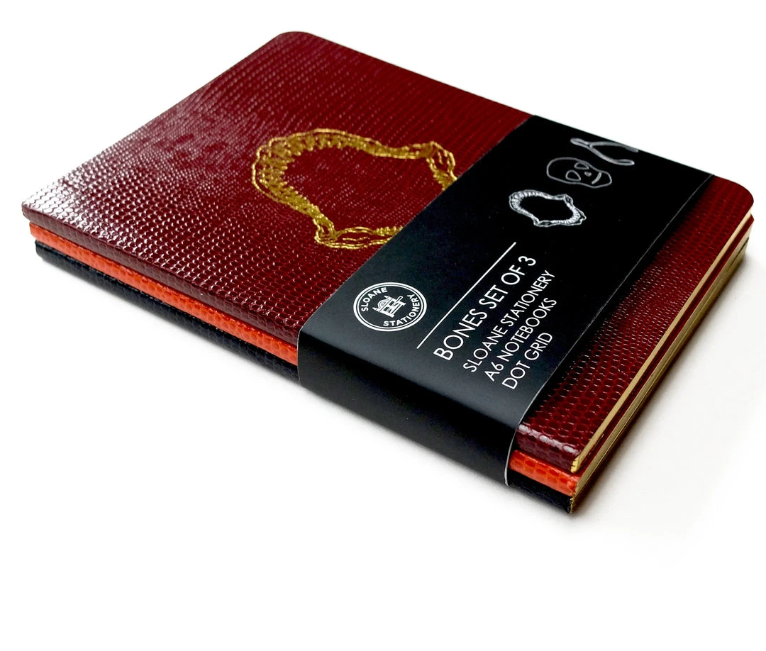 Thin, pocket-sized softcover notebooks sold as a set of 3, wrapped in a black sleeve showing each title on the cover. Convenient A6 size (10cm – 15cm) size with dot-grid paper, gold edge and embossing.