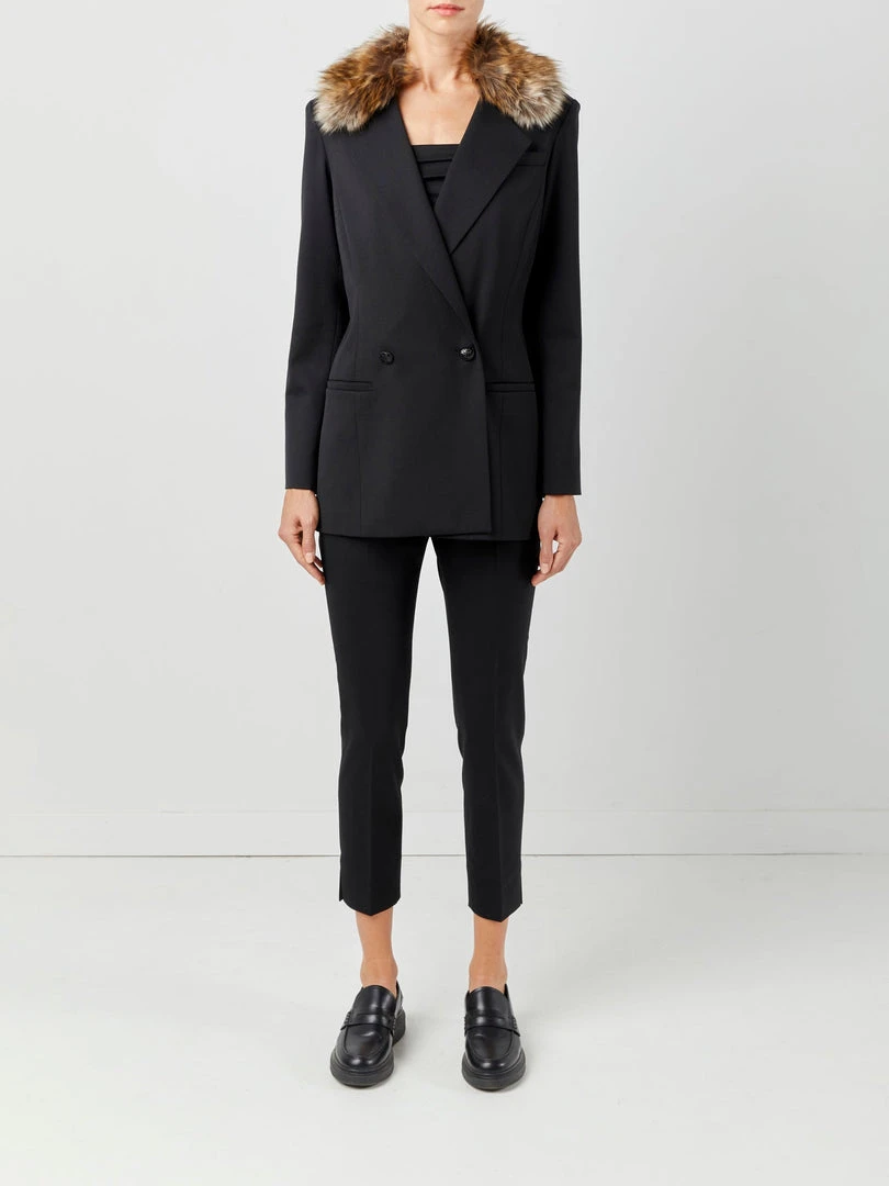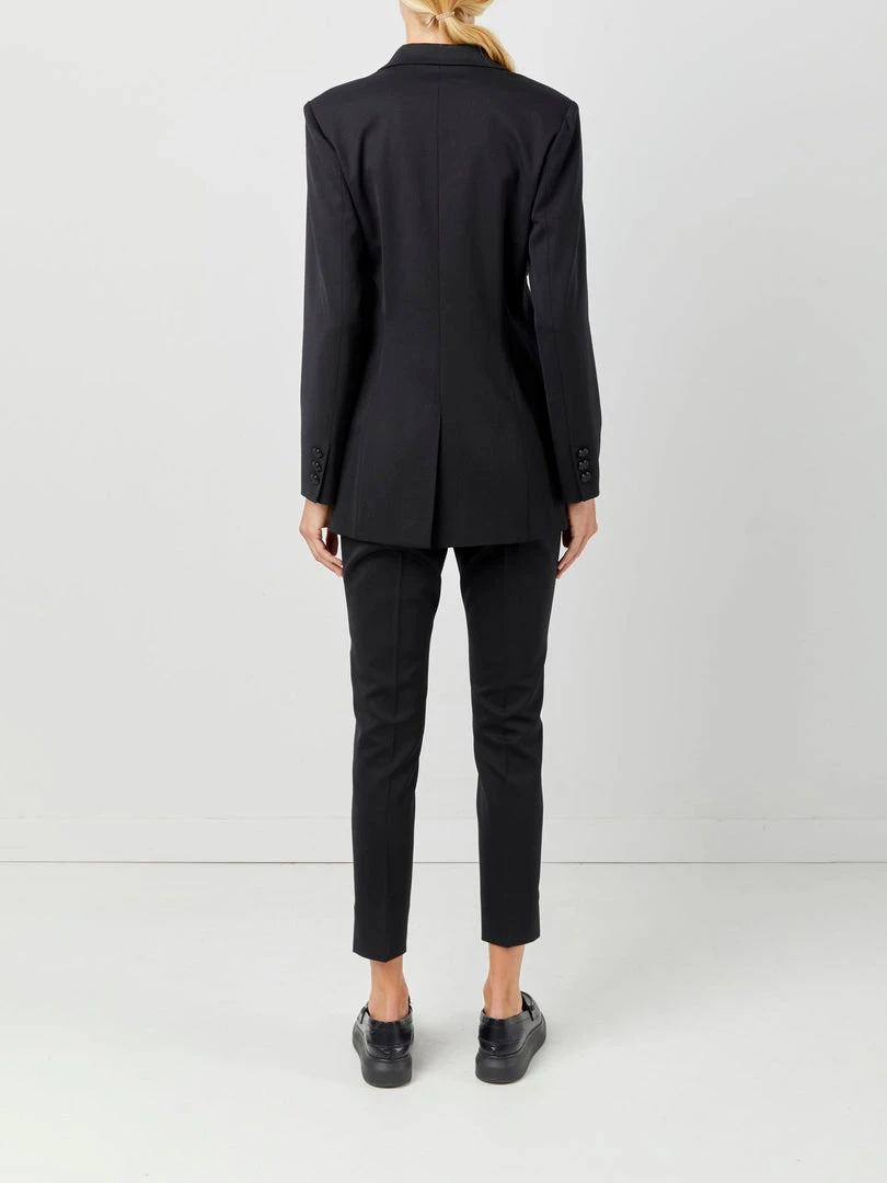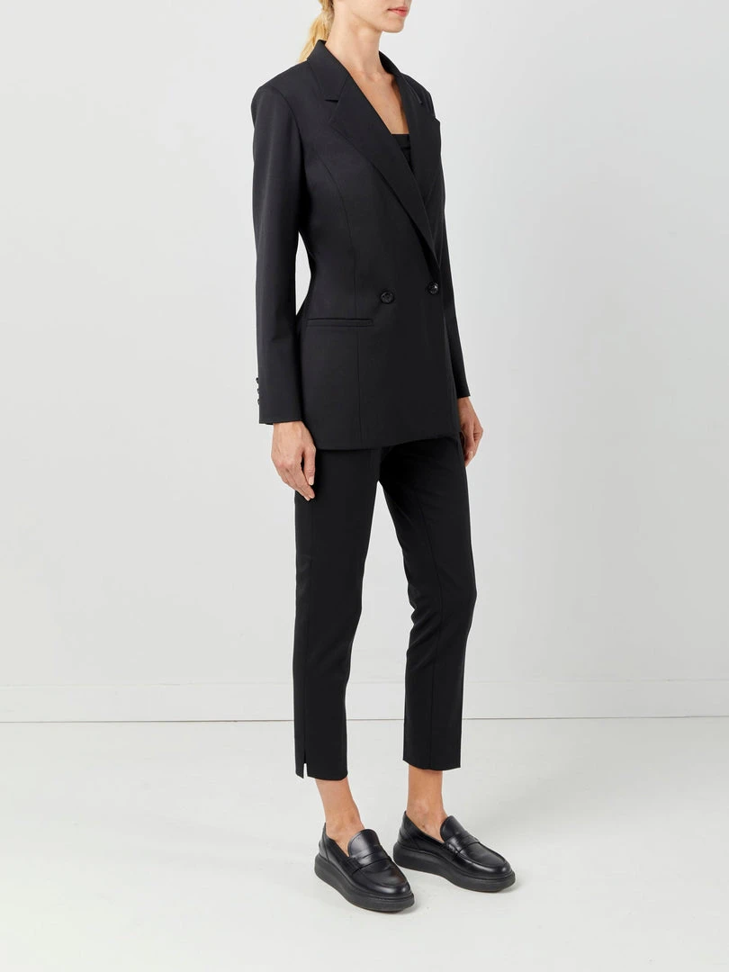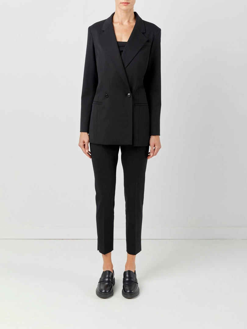 This classic oversized double-breasted blazer is made of lightweight Italian wool. Available with coordinating top and pant.