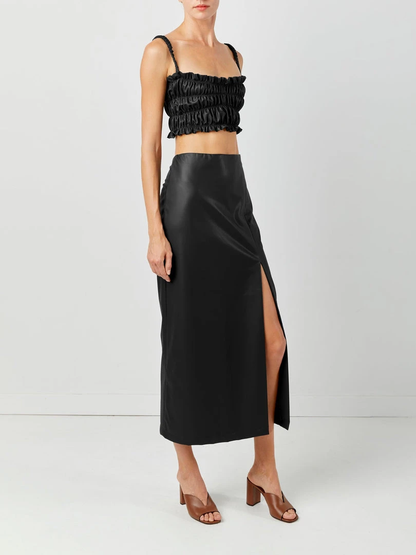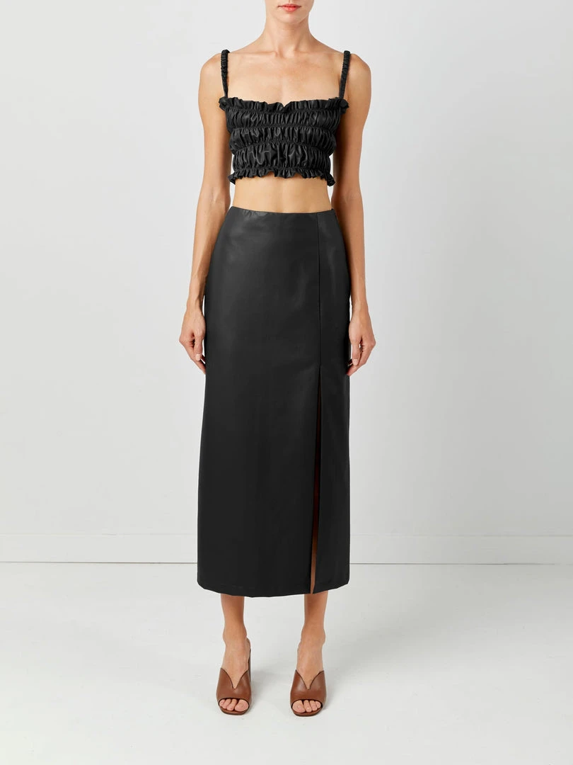 Great for day or night, this skirt looks best with our coordinating smocked top, but also pairs beautifully with one of our ribbed tops or body suit. Made from 100% vegan leather.