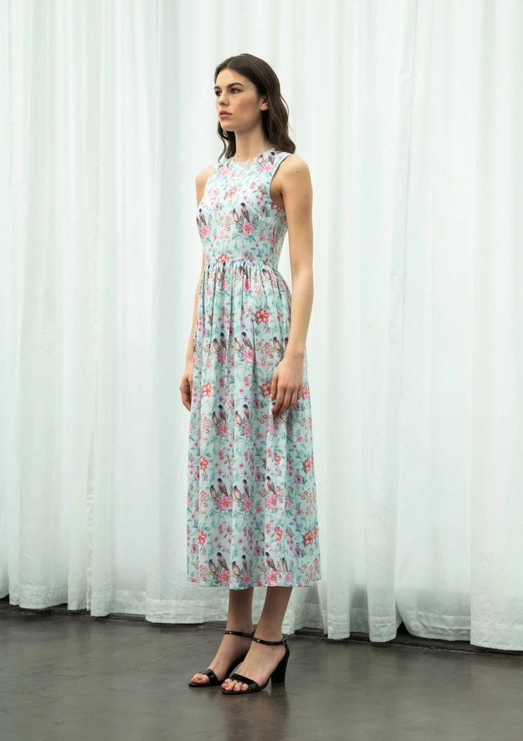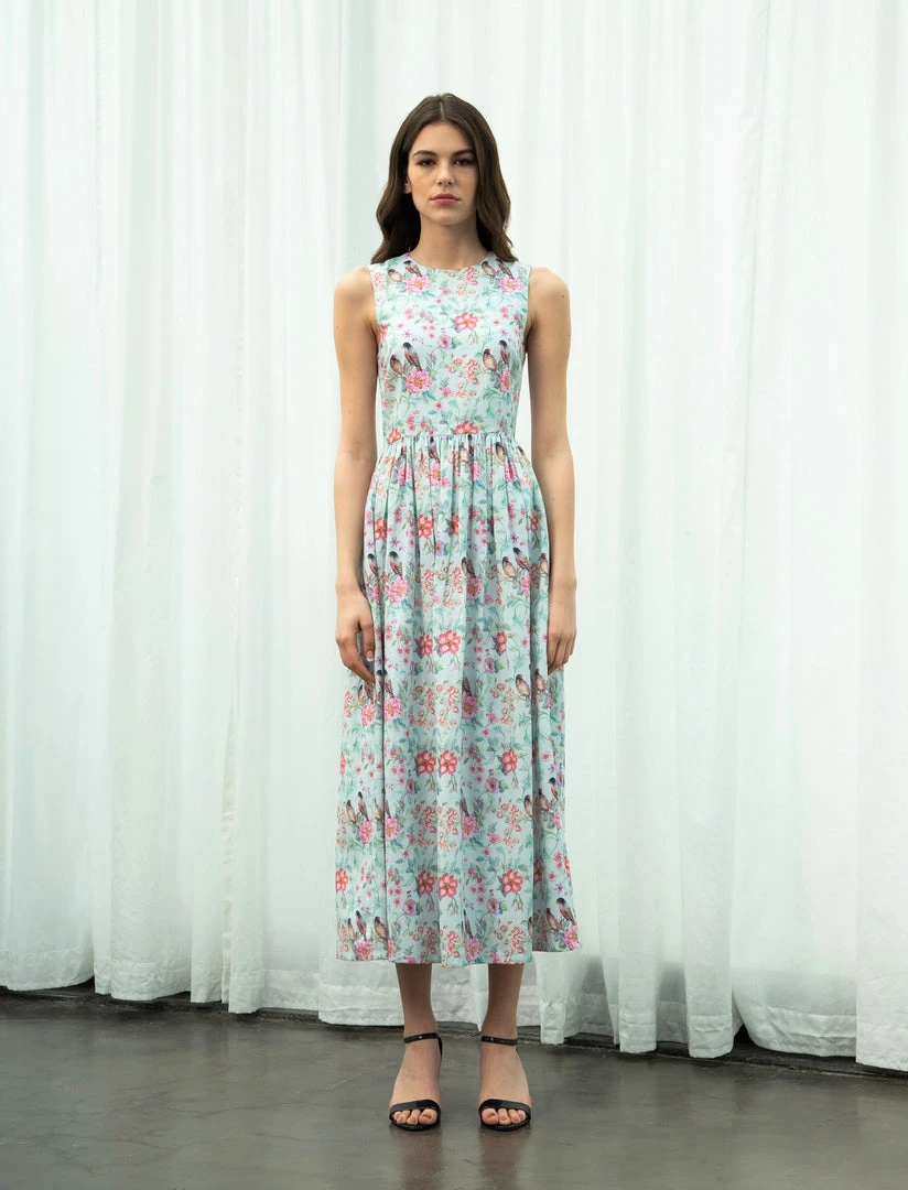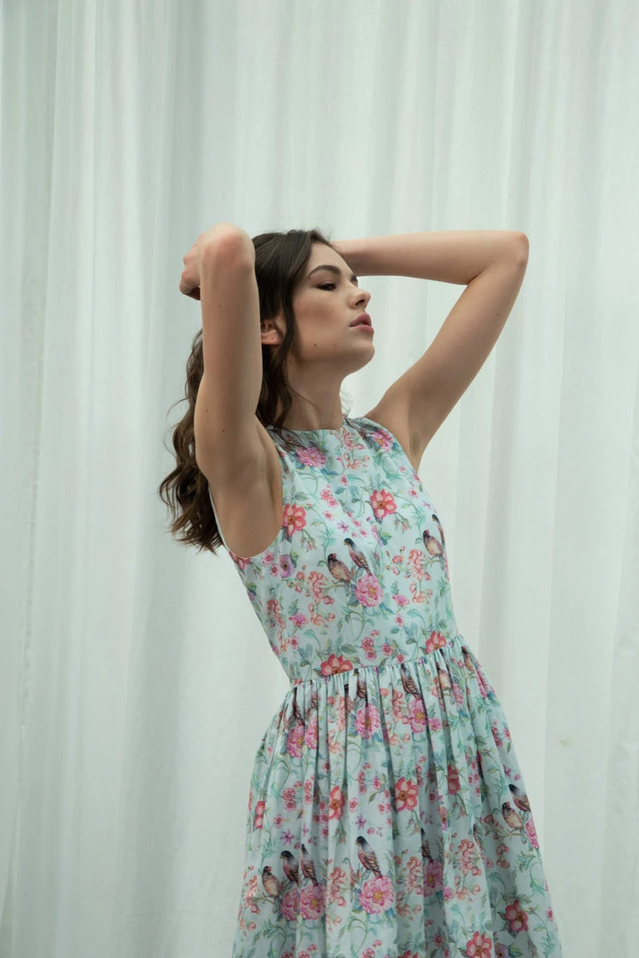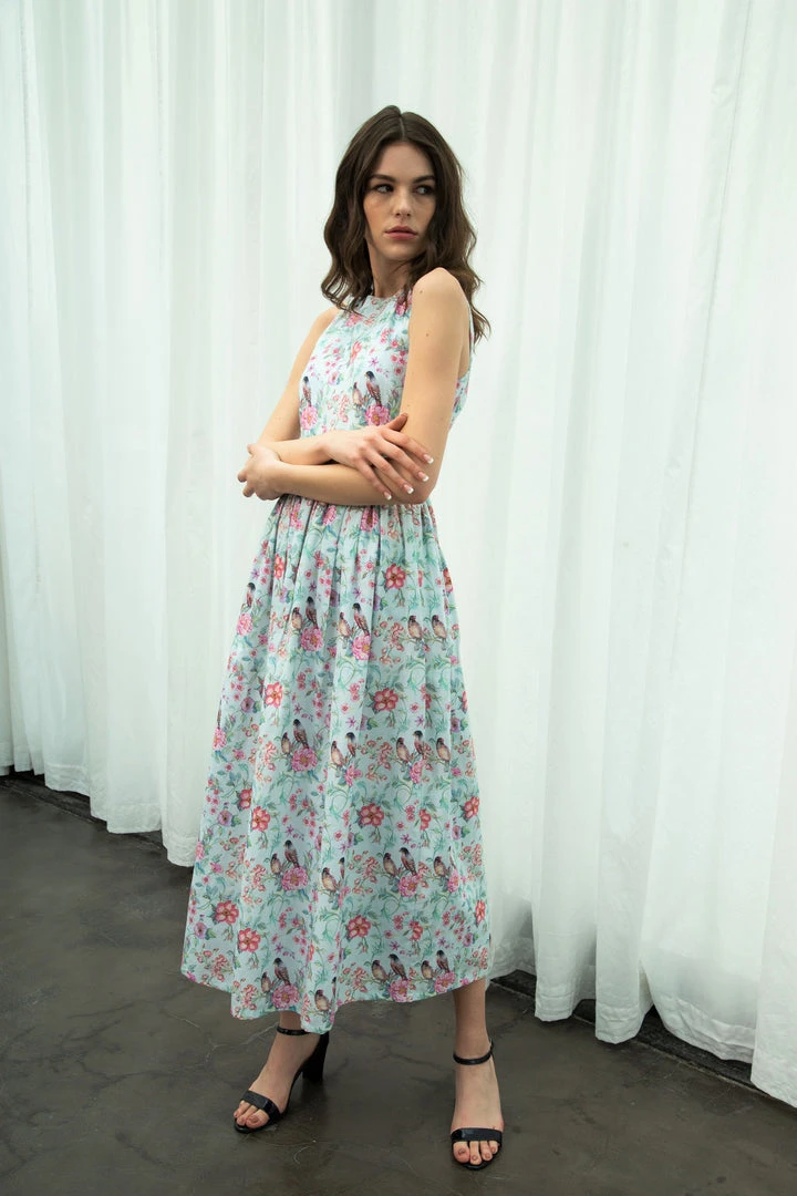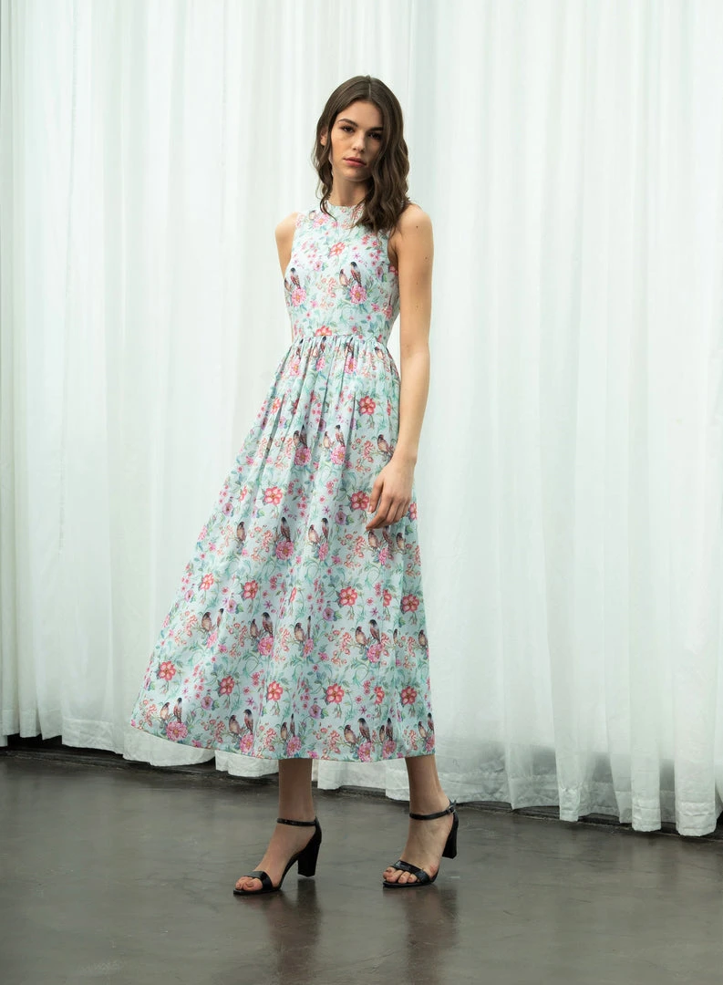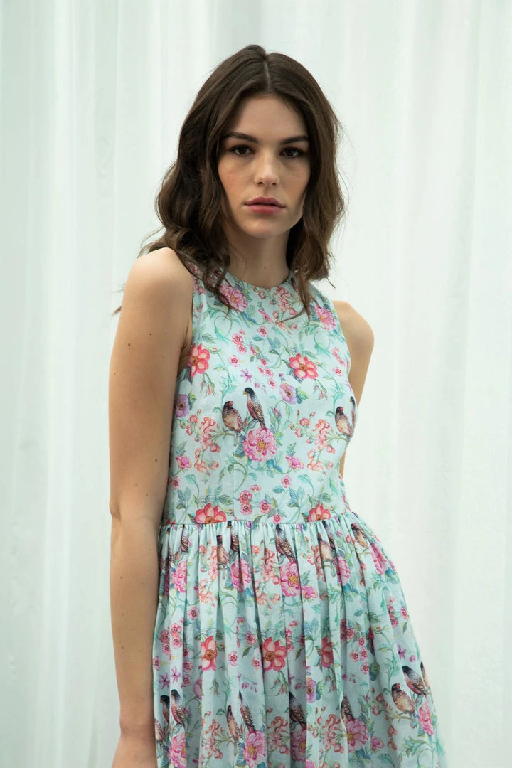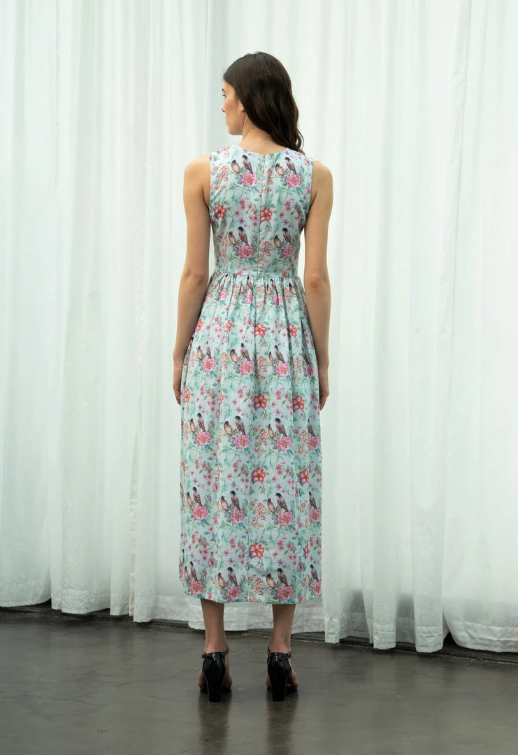 Inspired by the love birds, tropical breeze, and sandy beaches, this dress is a tribute to the summery heaven. Crafted with the softest breathable organic cotton, this light-as-air dress reflects the soothing and shiny shores with a palette of ice blue, delicately hand-painted with ‘jaal’ prints and gathering details perfect for days that demand grace and poise.
