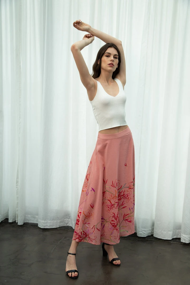 This beautiful skirt is stitched in 100% organic cotton, where simplicity meets sophistication. Designed in a free-flowing silhouette that spell ‘relaxed’, comes in coral peach hue and is finished with meticulously spider lily prints. Made for work or play all day long, this piece makes you chic and (eco) responsible at the same time.