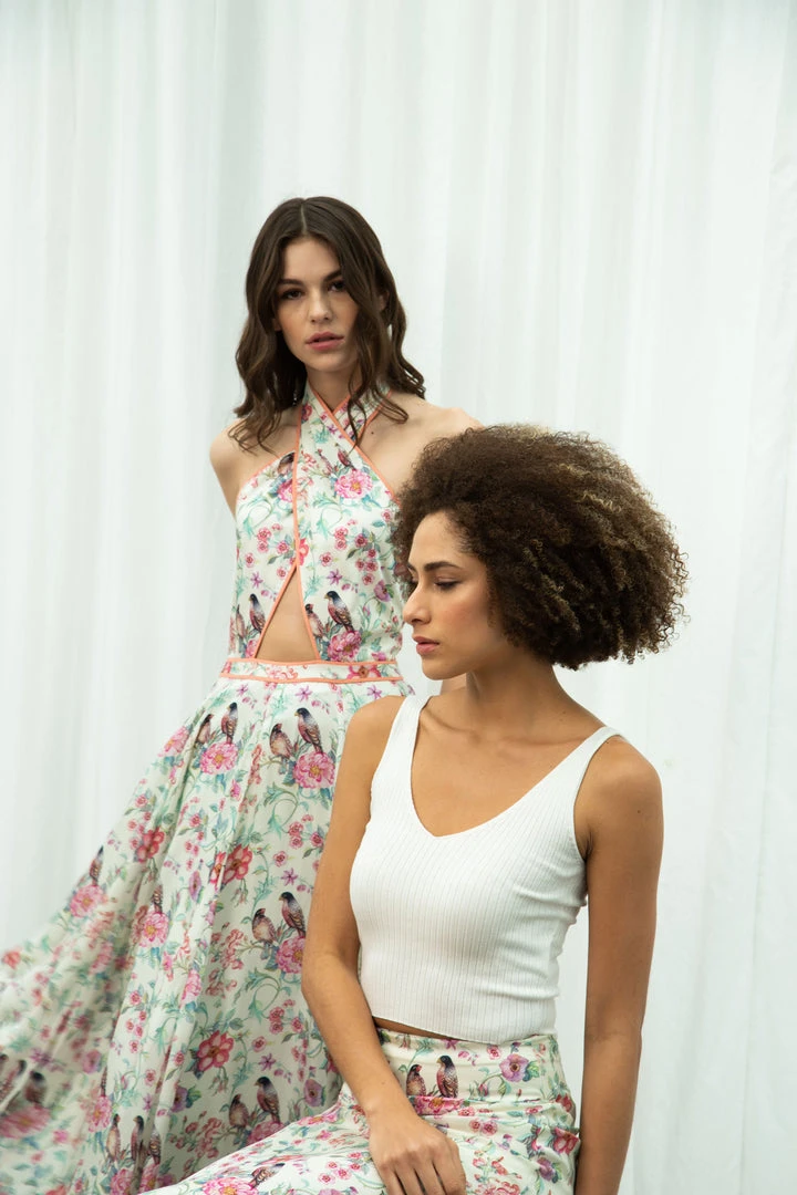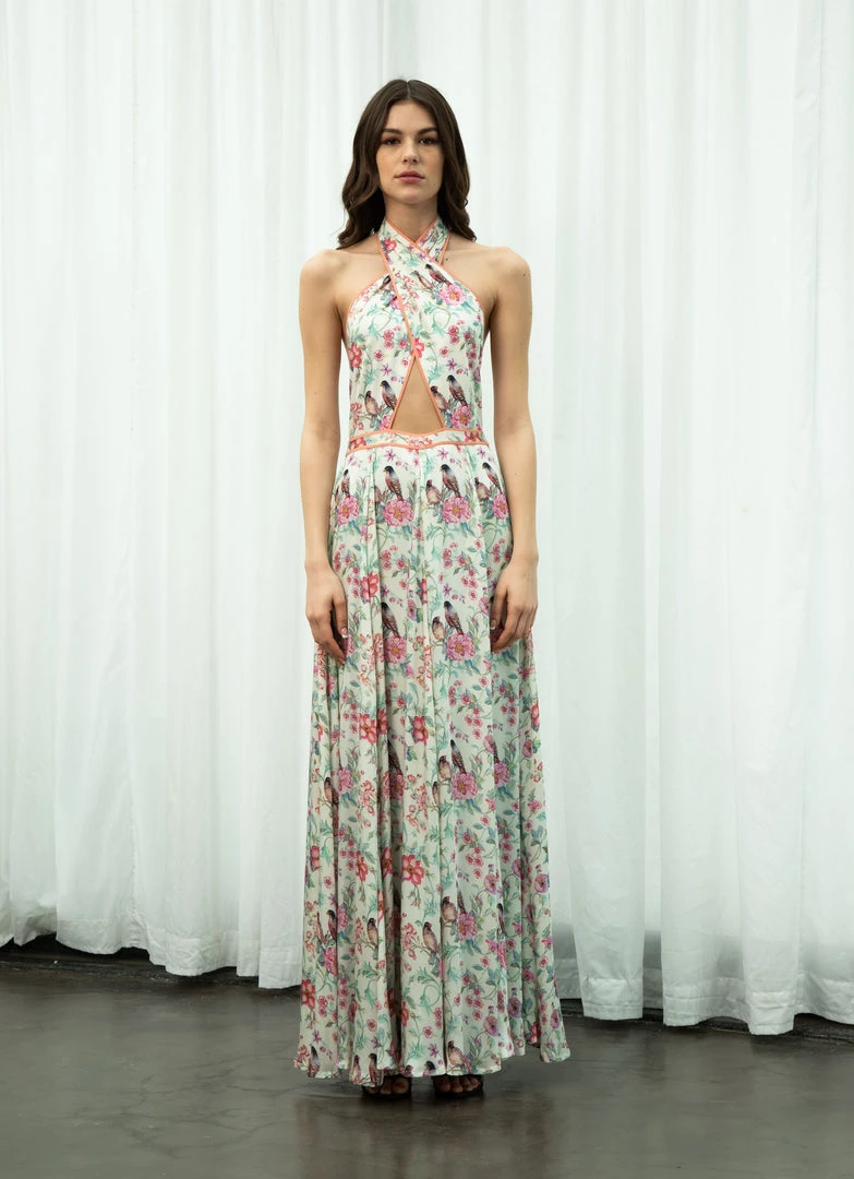 Made using rich satin fabric, and bold cross-neck silhouette, this dress is for the well-traveled woman whose personal style exemplifies her easy-going, yet fashion-forward approach to clothing. With attention to exceptional fit in love birds’ jaal print, this ensemble is crafted with an exotic, toes-in-the-sand spirit.