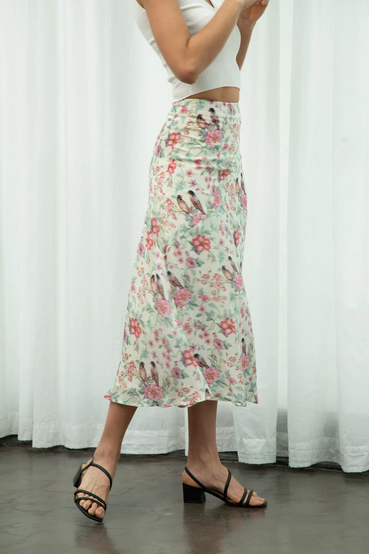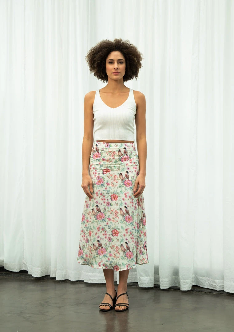 Breeze through summer in this sophisticated skirt, featuring dreamy floral and a minimalist silhouette adorned with overall love birds jaal prints. The soothing off-white color and the soft texture of satin make this skirt perfect for both evenings and for the hot, balmy days coming at us.