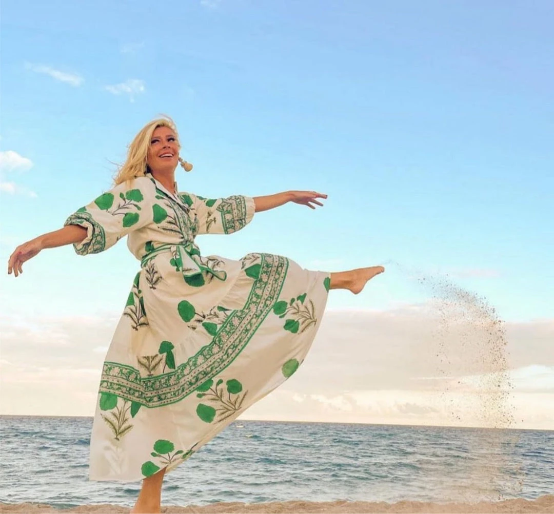 The original Paloma in emerald green floral marigold block print beauty will take you from the beach to dinner or festive special event ~ surely to be a comfy travel ready fave!