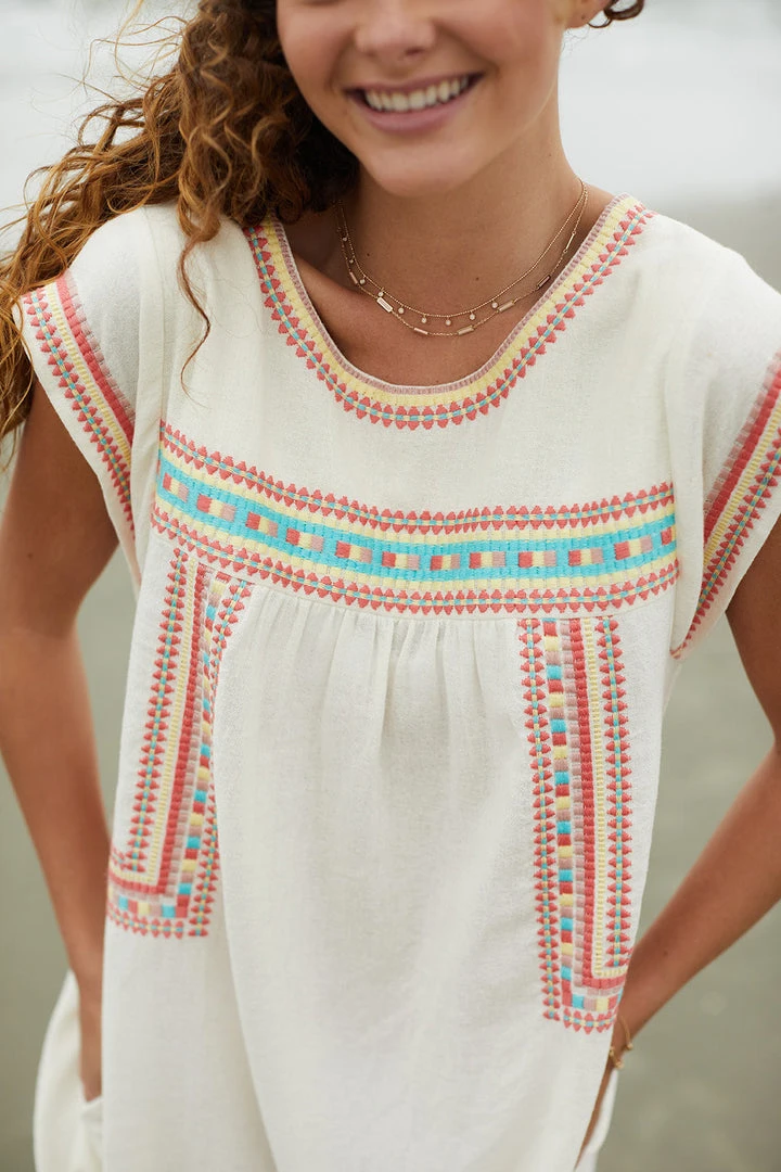 A playful, casual silhouette. Body framing embroidery detail. Hidden pockets.