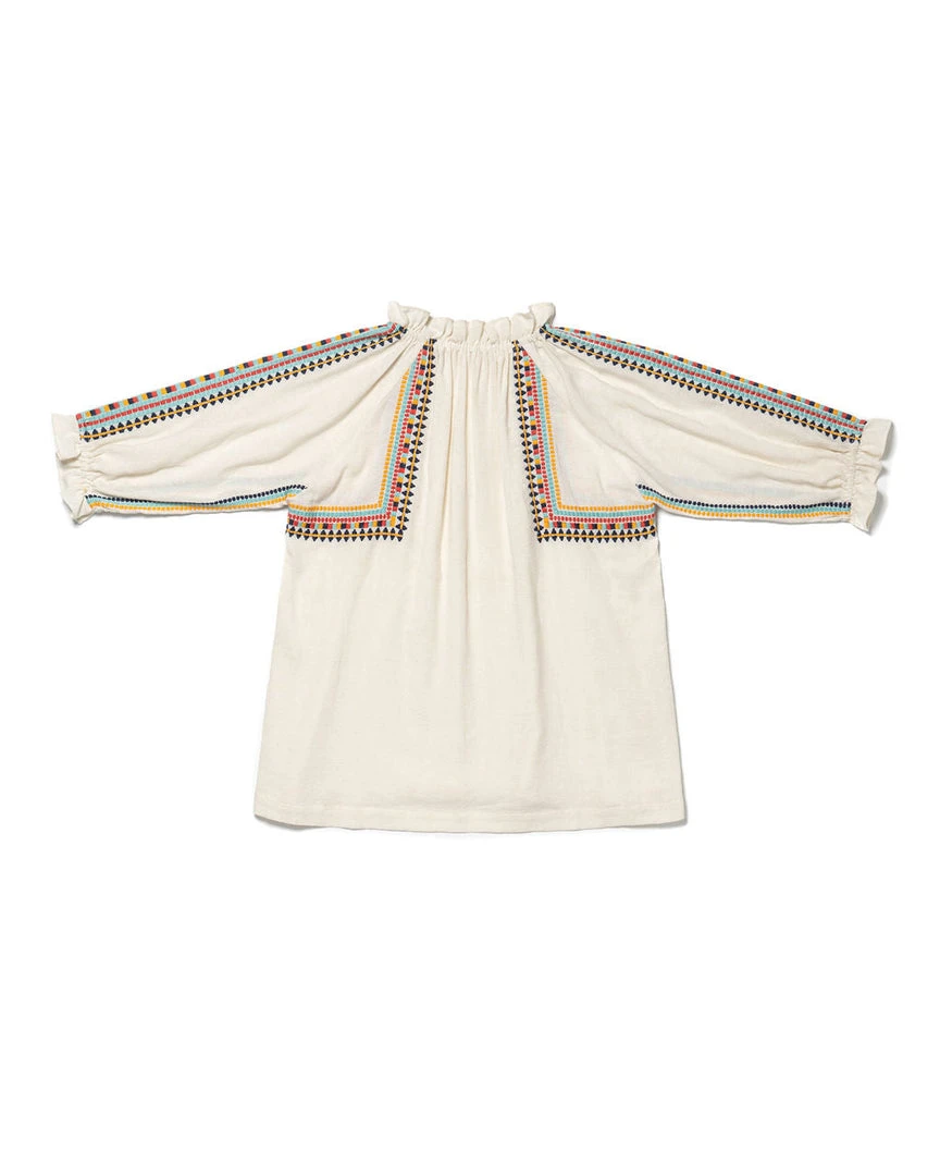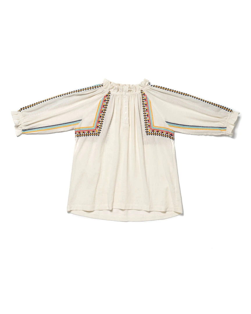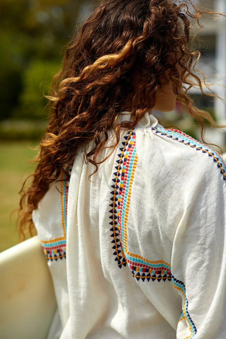 A casual shape with body framing embroidery that is detailed and flattering. 3/4 length sleeves with a four button front placket at the neck opening. A substantial ruffle at the neckline and armhole opening gives this top a feminine twist. Slightly sheer on the body.