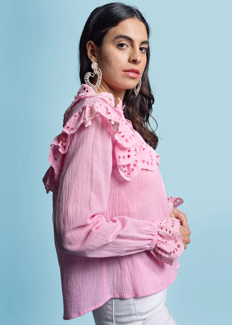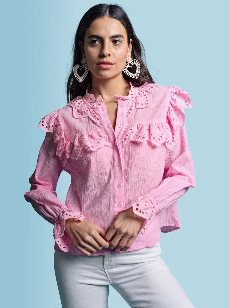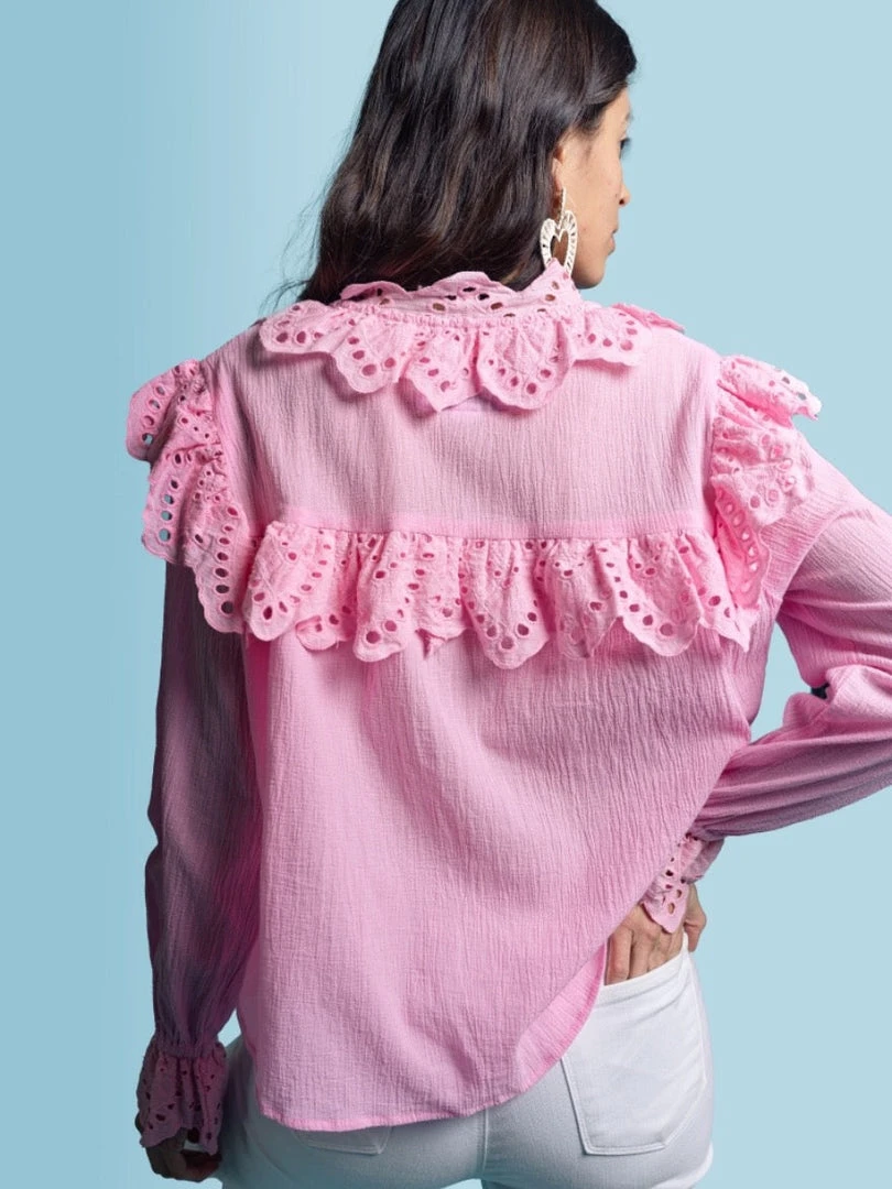Oversized eyelet trim line the seams of this very lightweight top which has a slight swing to it.