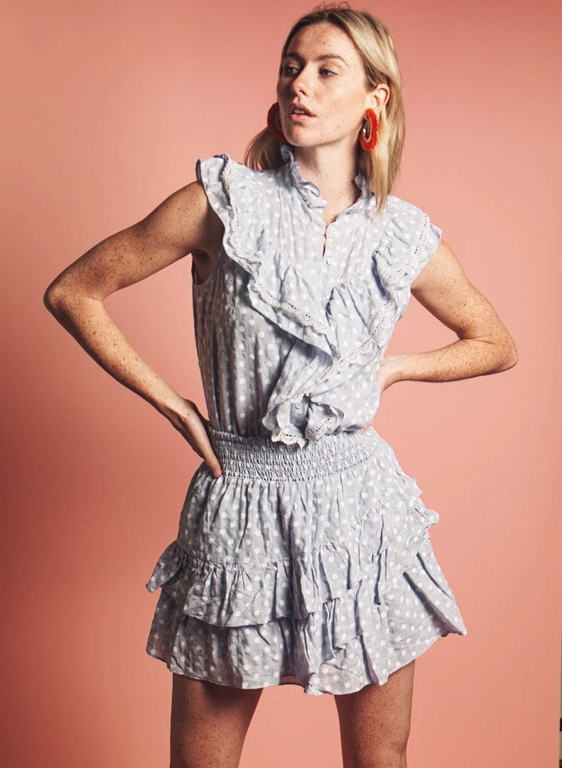 Dramatic ruffles cascade down the front of this sleeveless ruffled shirt.