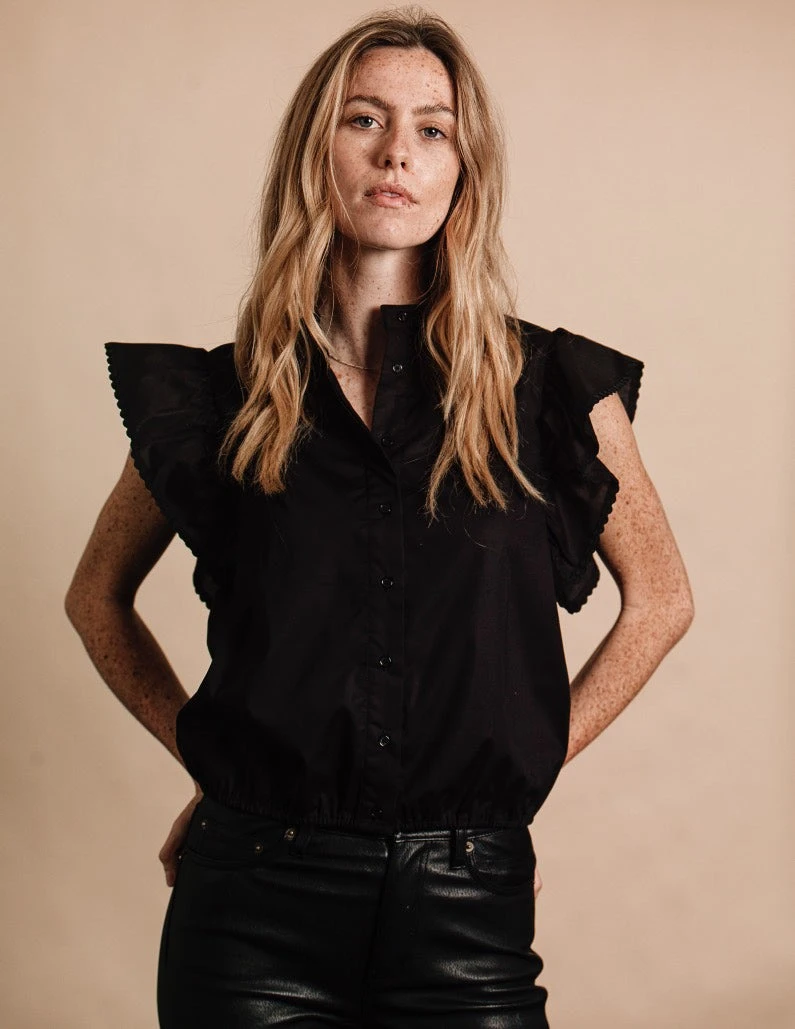 With fluttered short sleeves and an elasticized gathered waist, this button down will turn heads and will probably be your new favorite shirt. Â