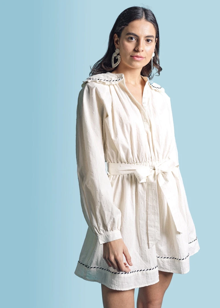 A dress for all seasons, not too short, an open neckline and a louche, relaxed fit. This one in our fresh cotton swissdot.