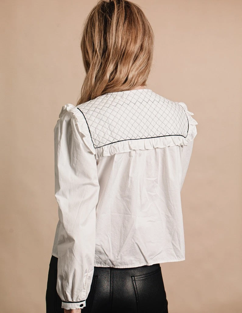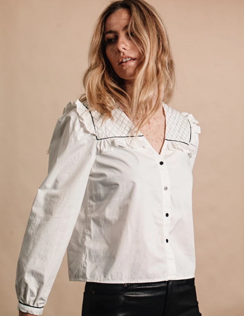 Show your style with our Victoria Shirt. Our lightweight cotton has black stitch quilting at the neck and is slightly cropped.