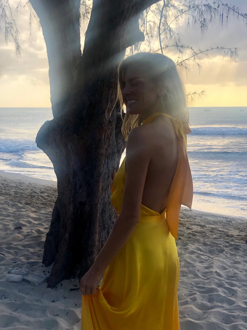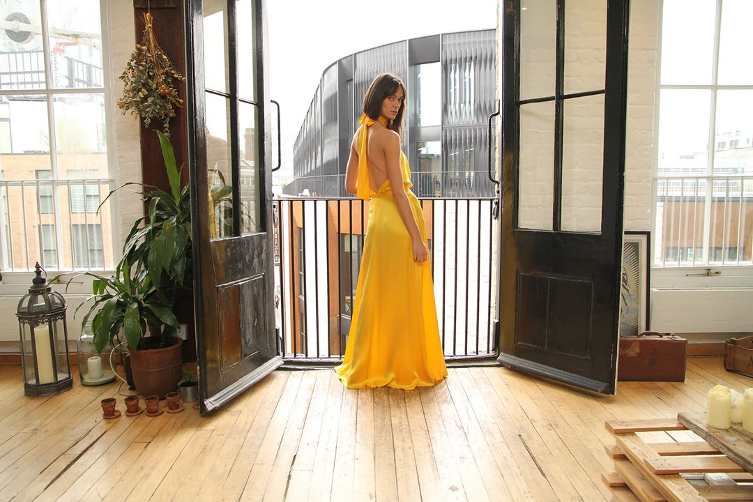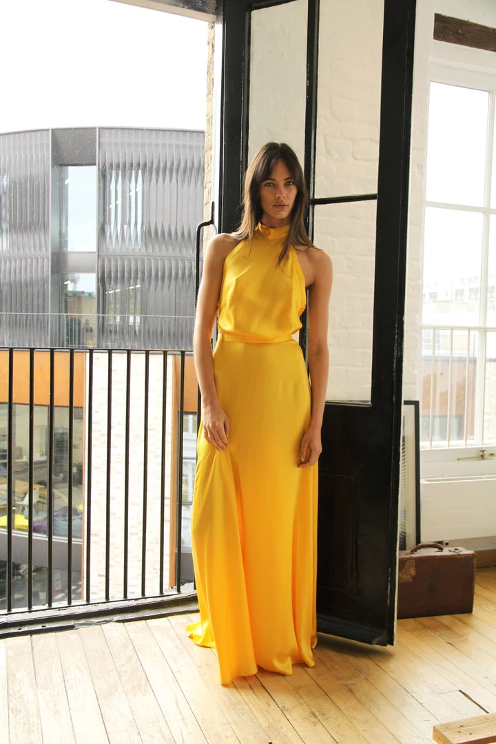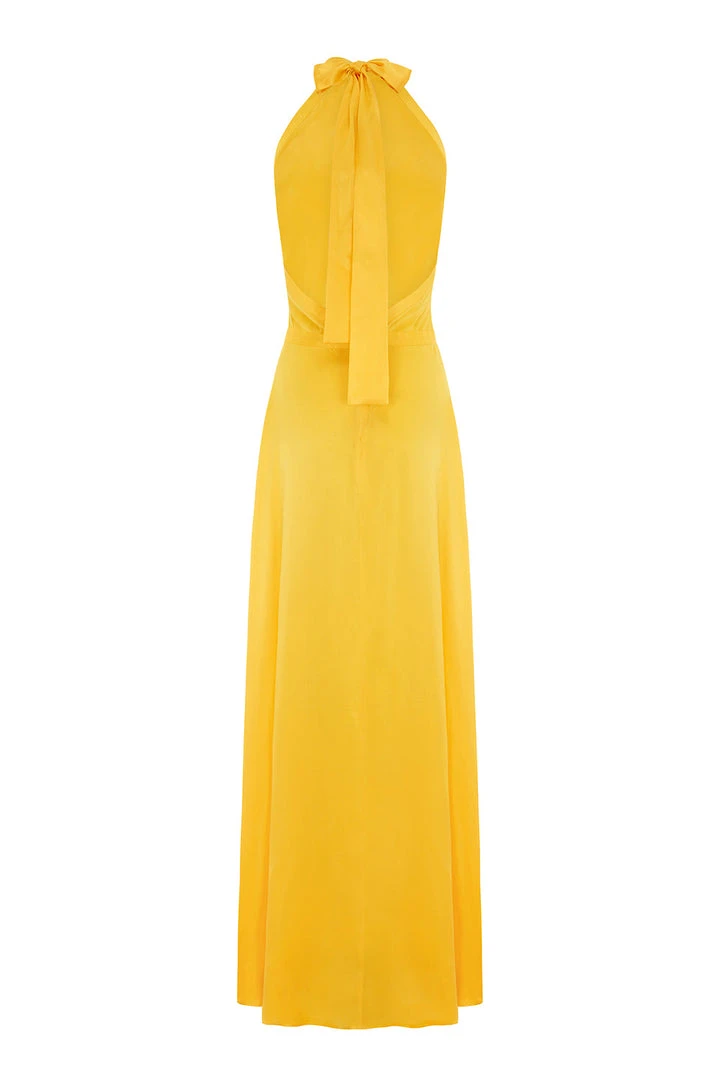 This floor-length wonder is the ultimate beauty and will make anyone feel like a true goddess, with its super flattering high waist skirt and the halter neck that fastened in the nape of the neck by long silk ties which fall down the length of the back.