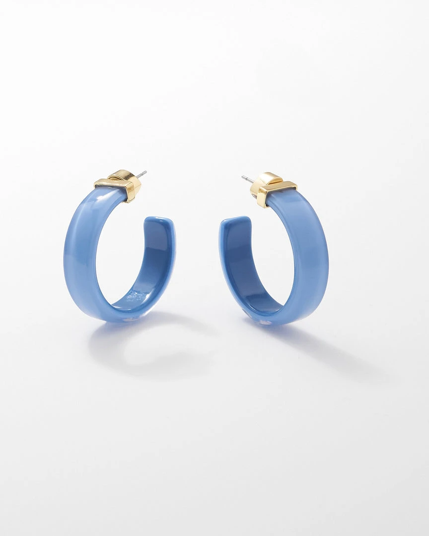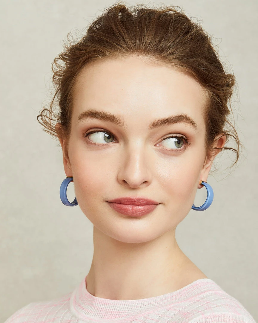 A day hoop that also loves a nightcap. This lightweight mid-size earring is crafted from three layers of glossy acetate (made from plant-based acetate) for fresh, contrasting color and finished with a heart-shaped postback for a little extra love.