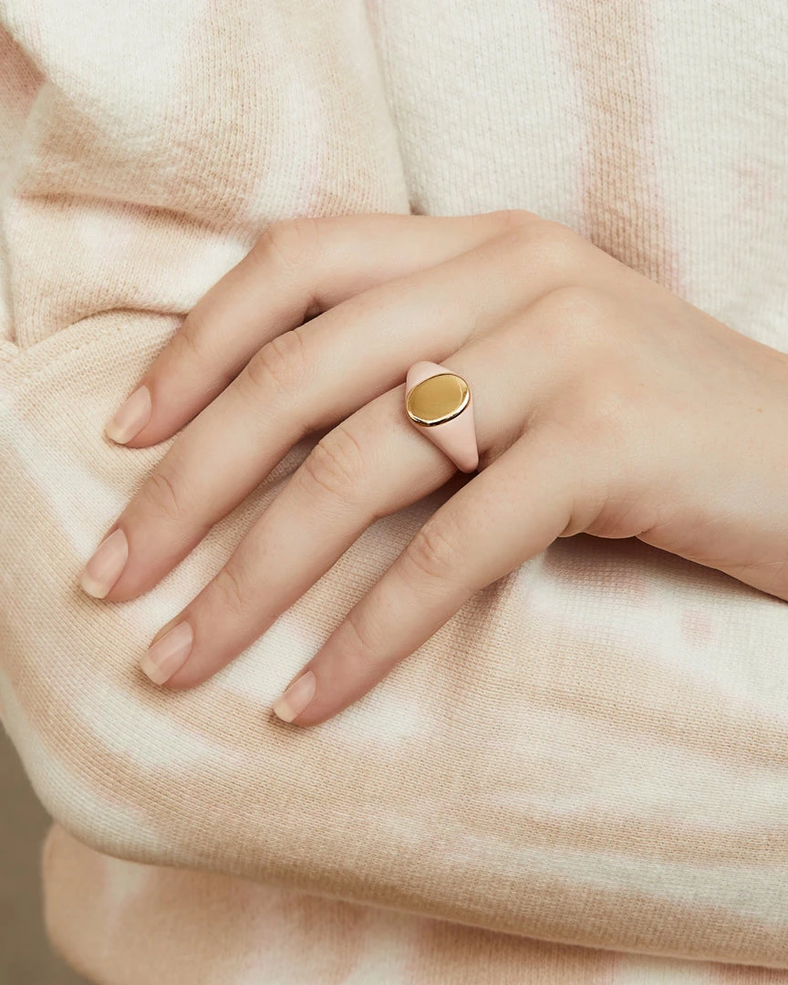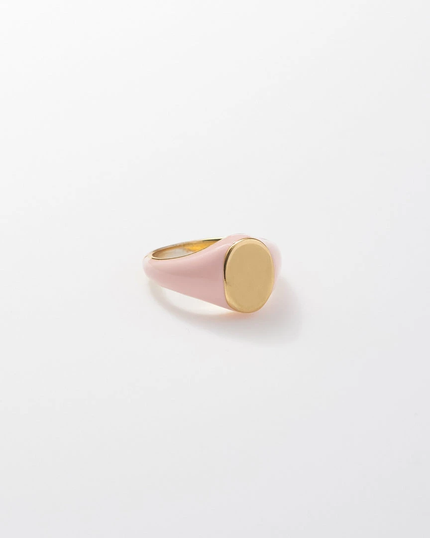 Make it personal. Our vintage-inspired signet ring is hand-enameled in a sweet shade of pink and finished with a luxuriously thick layer of ethically-sourced gold plating that’s perfect for a custom engraving.Â